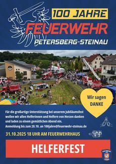 Die Feuerwehr Steinau möchte sich für die großartige Unterstützung bei den Festivitäten im Rahmen des 100. jährigen Jubiläums bedanken. Alle Helferinnen und Helfer sind daher recht herzlich am 31.10.2025 zu einem Helferfest eingeladen.
