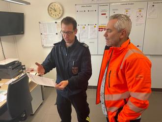 Außerdem wurden die Kommunikation und Abläufe in der Einsatzleitung - hier Gemeindebrandinspektor Christoph Möller und Bürgermeister Carsten Froß - im Feuerwehrhaus Petersberg-Mitte geübt.