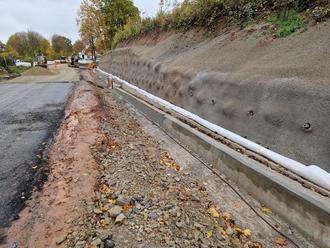 Die Bauarbeiten sind nun in einer neuen Phase. Seit wenigen Wochen ist die Baufirma dabei, die Fahrbahn zu asphaltieren. Geplant ist, dass die Vollsperrung Mitte Dezember aufgehoben werden kann. Damit kann der Verkehr zwischen der B27 und dem Ortseingang Marbach endlich wieder fließen. Das Fundament der Stützmauer ist ebenfalls fertiggestellt, sodass der Hang bereits jetzt dauerhaft und nachhaltig abgesichert ist.