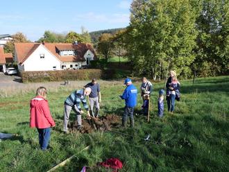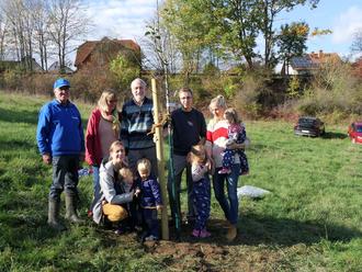 Zum Renteneintritt wurde Herr Drott von seiner Familie mit dem Geschenk eines Apfelbaums überrascht, der fortan auf einer Streuobstwiese in Marbach steht. Ende Oktober versammelte man sich dort zur gemeinsamen Pflanzaktion mit Herbert Schmitt und Michael Heinz vom NABU. Unter Anleitung des langjährigen Naturexperten Herbert Schmitt wurde der Baum durch die Familie fachgerecht gepflanzt.