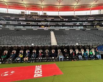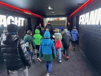 Die aufgeregte Mannschaft traf sich am Mittag, um mit dem Gemeindemobil nach Frankfurt zu fahren. Mit großen Augen bestaunten die jungen Spieler bereits von außen die imposante DeutscheBank-Arena. Ein freundlicher Mitarbeiter des Vereins führte die Kinder anschließend durch das Museum und das Stadion.
