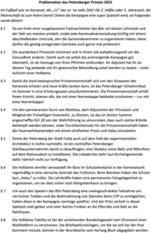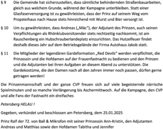 | § 9 | Die Gemeinde hat sicherzustellen, dass sämtliche behindernden Straßenbauarbeiten, gleich aus welchem Grunde, während der Kampagne unterbleiben. Statt einer Glasfaserversorgung ist zu gewährleisten, dass der Prinz auf seinem Weg vom Propsteihaus nach Hause stets hinreichend mit Wurst und Bier versorgt ist. |