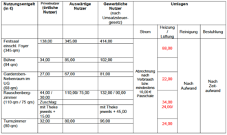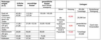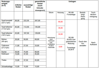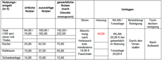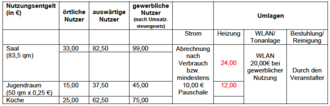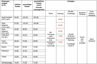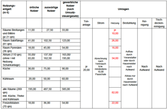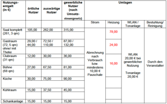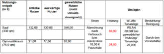 | 5) | Das Nutzungsentgelt für Körperschaften des öffentlichen Rechts, Schulen und Institutionen, die dem Gemeinwohl dienen, wird nach dem Tarif "örtliche Nutzer" berechnet. |