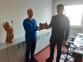 Über dieses Geste war der Petersberger Pfarrer Togar Pasaribu positiv überrascht: Der Heimatverein Petersberg übergab der Pfarrei St. Lioba zur Einweihung ihres umgebauten Pfarrbüros ein Lichthaus-Modell des Petersberger Wahrzeichens, der Liobakirche als Geschenk.