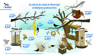 Mit Körnerfutter lassen sich gezielt Körnerfresser wie Buchfink, Gimpel und Spatz an das Futtersilo anlocken. Weichfutterfressern wie Amsel, Rotkehlchen oder Heckenbraunelle kann man mit Haferflocken, Obststücken, Rosinen oder getrockneten Wildbeeren die harte Zeit erleichtern. In kleinen Holzgestellen lassen sich zum Beispiel Äpfel feststecken. Für Allesfresser wie Meisen sind die bekannten Meisenknödel oder Meisenringe sowie Drahtbehälter mit Nüssen das richtige Angebot. Plastiknetze sollte man dabei vermeiden, da sich Tiere dort verfangen können. „Besonderes Augenmerk sollte auf die Herkunft der Sämereien gelegt werden“, betont Petri. „Billige Futtermischungen sind oft mit Samen der Allergie auslösenden Ambrosie oder anderen nicht erwünschten Pflanzen verunreinigt.“ Der NABU appelliert an Vogelfreunde, keine Speisereste zu verfüttern, da sie für Vögel in der Regel nicht bekömmlich sind. Besonders problematisch sind gesalzene Speisen.