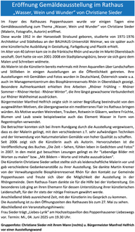 Im Foyer des Rathauses Poppenhausen wurde vor einigen Tagen eine Gemäldeausstellung zum Thema „Wasser, Wein und Wunder“ von Christiane Sieder (Malerin, Fotografin, Autorin) eröffnet.