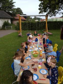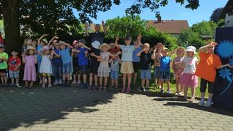 Wenige Tage später wurden die Kinder traditionell mit einem Abschlussgottesdienst aus der Kita in Richtung Grundschule verabschiedet. Bei bestem Wetter konnte der Gottesdienst, welcher von den Kindergartenkindern dargestellt und gestaltet wurde, draußen auf dem Außengelände der Kita stattfinden. Herr Pfarrer Jörg Stefan Schütz ließ hierbei die Kindergartenzeit der „Großen“ Revue passieren und ging auf die bevorstehende Schulzeit ein. An das Gottesdienstthema angelehnt trugen die Kinder mit einem Regenbogentanz, einer Darstellungsgeschichte und Gesang ihrerseits zum guten Gelingen des Gottesdienstes bei. Bei Kaffee und Kuchen sowie netten Gesprächen klang der Nachmittag aus.