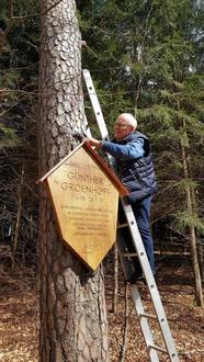 Die am Absturzort an einer Kiefer angebrachte hölzerne Gedenktafel war inzwischen nicht mehr lesbar. Fliegerkamerad Edgar Kremer (85) vom Rhönflug Poppenhausen e.V., Seniorchef des Alexander-Schleicher-Segelflugzeugwerks, nahm den bevorstehenden Tag der Erinnerung (90 Jahre seit dem Absturz) zum Anlass, die Gedenktafel zu erneuern. Er hatte seinen ehemaligen Mitarbeiter und Hobby-Schnitzer Stephan Schäfer aus Rabennest gebeten, die Gedenktafel getreu der alten Vorlage nachzubilden. Wie man es sehen kann, ist dies bestens gelungen.