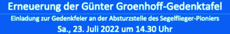 Am Samstag, den 23. Juli 2022, soll nun um 14.30 Uhr in einer kleinen Gedenkfeier dem Absturz von Günther Groenhoff vor 90 Jahren gedacht werden. Alle Interessierten werden hiermit eingeladen, dabei zu sein.
