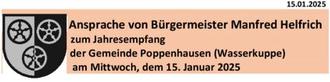 Zum 23. Jahresempfang der Gemeinde Poppenhausen (Wasserkuppe) heiße ich Sie alle hier im Von-Steinrück-Haus herzlich willkommen. Eigentlich wäre es heute sogar der 25., aber die Pandemie sorgte für 2 Ausfälle.