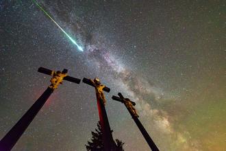 Der Monat August steht ganz im Zeichen der Perseiden, des stärksten auf der nördlichen Halbkugel sichtbaren Sternschnuppenschwarms. Vom 9.8. bis 13.8. erreicht er sein Maximum– in diesem Jahr ohne beeinträchtigenden Mond. Die Perseiden sind auf Überreste des Kometen 109P/Swift-Tuttle zurückzuführen und haben ihren Ausgangspunkt im Sternbild Perseus, welches zu Monatsbeginn gegen 24 Uhr am nordöstlichen Horizont erscheint und im Laufe der zweiten Nachthälfte dann nach Süden hinaufsteigt. Helle Objekte und Feuerkugeln sind hierbei keine Seltenheit – es lohnt sich die Beobachtung mit bloßem Auge oder das Aufstellen einer Kamera. Auf alle Fälle sollte man sich den Zauber nicht entgehen lassen und jede klare Nacht im August nutzen.