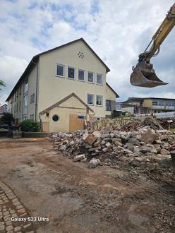 Zunächst wurde die alte Pausenhalle weggenommen. Nach den Aufräumarbeiten erfolgt die Entwässerung und der Einbau der Bodenplatte, bevor der Baukörper in Holzbauweise erfolgt.