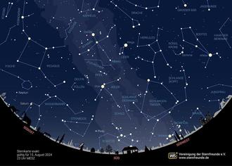 Wie schon im Juli wird der Sternenhimmel vom Sommerdreieck der drei hellen Sterne Wega im Sternbild Leier, Deneb im Sternbild Schwan und Altair im Sternbild Adler dominiert. Die August-Nächte sind nun auch wieder dunkel genug, um in das Sternenmeer der Milchstraße einzutauchen. Die Sommermilchstraße erstreckt sich vom Sternbild Cassiopeia im Norden quer über den Himmel bis zum Sternbild Schütze tief im Süden. Auf dem Rücken liegend kann man entlang der Milchstraße bereits mit einem Fernglas Sternhaufen und diffuse Nebel erkennen. Innerhalb der Milchstraße sind immer wieder sternenärmere Bereiche zu sehen, die aus sogenannten Dunkelwolken bestehen. Hierbei handelt es sich um Wasserstoffgas, das nicht durch Sterne zum Leuchten angeregt wird.