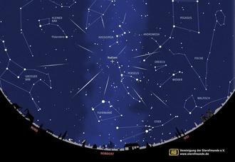 Die Perseiden sind auf Überreste des Kometen 109P/Swift-Tuttle zurückzuführen und haben ihren Fluchtpunkt im namensgebenden Sternbild Perseus, das zu Monatsbeginn gegen 24 Uhr am nordöstlichen Horizont erscheint und im Laufe der zweiten Nachthälfte dann nach Süden aufsteigt. Alljährlich fliegt die Erde durch die vom Kometen hinterlassene Staubspur. Dringt ein solches Staubkörnchen in unserer Erdatmosphäre ein, wird diese zum Leuchten angeregt - und wir sehen das, was wir Sternschnuppe nennen.
