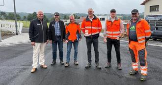 v.r.: Stefan Metz (Kolonnen-Polier), Jannik Stäblein (Bauleitung), Dirk Hess (Prokurist)-alle Fa. SST, Hans- Ulrich Schott (Planungsbüro), Stephan Unger (Bauamtsleiter) u. Bürgermeister Manfred Helfrich.