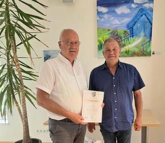 Foto - Gemeinde: Der Dienstjubilar Thomas Metzler (rechts) u. Bürgermeister Manfred Helfrich)