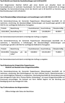 Die Gemeindevertretung der Gemeinde Poppenhausen (Wasserkuppe) beschließt mit 14 Jastimmen, einstimmig, die überplanmäßigen Aufwendungen und Auszahlungen gemäß § 100 HGO für die nachfolgende Maßnahme freizugeben.
