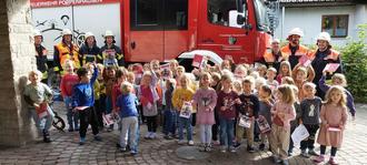 Als kleine „Ersthelfer“ dürfen sich die Schulanfänger der Kath. Kita St. Elisabeth fortan nach einem einwöchigen Erste- Hilfe-Kurs bezeichnen. Das Projekt „Abenteuer Helfen“, welches vom Malteser Hilfsdienst Fulda angeboten wird, verschaffte den 18 Schulanfängern einen Einblick in die Welt der Notfallrettung. Eine Woche lang wurden die Kinder zum Thema Erste-Hilfe geschult. Altersgerecht und auf spielerische Art und Weise haben die Jungen und Mädchen die wichtigsten Grundlagen und Maßnahmen zur Hilfe in Notfällen vermittelt bekommen. So lernten sie beispielsweise die Handhabung von Wundschnellverbänden oder das Absetzen eines Notrufs. Der Höhepunkt der aktiven Woche war dann der Besuch der Freiwilligen Feuerwehr Poppenhausen in der Einrichtung. Mit einer kleinen Übung im Gebäude sowie einer Fahrzeugbesichtigung konnten die Feuerwehrfrauen und -männer die Kinder begeistern. Zur Überraschung hatten die Brandschützer ein Feuerwehrmalbuch im Gepäck. Mit dem Einsetzen des Blaulichtes sowie der Sirene am Feuerwehrfahrzeug rückten die Einsatzkräfte wieder ab. Schon jetzt freuen sich die Kinder wieder auf den Besuch des großen Fahrzeuges im nächsten Jahr.