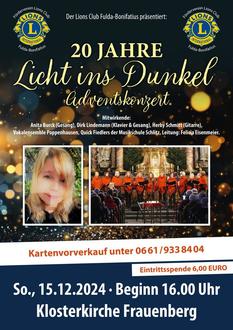 Am 15.12.2024 um 16.00 Uhr findet das Jubiläumskonzert „20 Jahre Licht ins Dunkel“ in der Klosterkirche am Fuldaer Frauenberg statt. Durch diese Konzertreihe, welche der Lions Club Fulda-Bonifatius veranstaltet, wurden in dieser Zeit mehr als 40.000.-€ an gemeinnützige Organisationen in der Region gespendet.