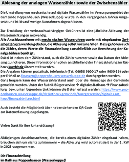 Die Umstellung von mechanische auf digitale Wasserzähler im Versorgungsgebiet der Gemeinde Poppenhausen (Wasserkuppe) wurde in den vergangenen Jahren umgesetzt und ist bis auf wenige Ausnahmen abgeschlossen.