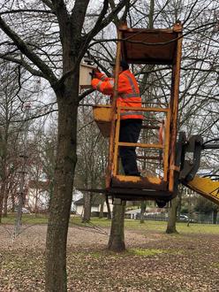 Die nur 12 cm große Meise ist derzeit emsig mit dem Nestbau beschäftigt. 55 Nistkästen, die der Bauhof in den Vorjahren an den bekannten „Einsatzorten“ des Eichenprozessionsspinners aufgehängt hat, wurden im Januar/Februar inspiziert und gereinigt. Alte Nester müssen entfernt werden, weil sie von den Meisen kein zweites Mal genutzt, und oft von Parasiten (Milben) befallen sind. Bei der Reinigung der „Kinderstuben“ wurde festgestellt, dass in 48 der 55 Kästen in der letzten Saison eine Brut erfolgt ist. Eine erfreuliche Erfolgsquote!
