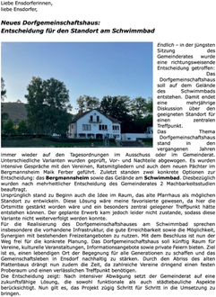 Endlich - in der jüngsten Sitzung des Gemeinderates wurde eine richtungsweisende Entscheidung getroffen: Das Dorfgemeinschaftshaus soll auf dem Gelände des Schwimmbads entstehen. Damit endet eine mehrjährige Diskussion über den geeigneten Standort für einen zentralen Treffpunkt.