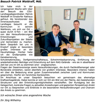 Ich habe mich in der vergangenen Woche sehr über den Besuch des CDU-Landtagsabgeordneten Patrick Waldraff im Ensdorfer Rathaus gefreut. Als Vorsitzender des Innenausschusses des Landtages besucht er die Kommunen in seinem Wahlkreis, um sich vor Ort - quasi durch O-Ton - ein Bild von den Herausforderungen, Entwicklungen und Zukunftsprojekten der Städte und Gemeinden zu machen. Beim Gespräch bei uns in Ensdorf zeigte er besonders großes Interesse an der Haushaltslage. Hierbei habe ich die Großprojekte wie Kanalsanierung, Schulersatzneubau, Dorfgemeinschaftshaus, Schwimmbadsanierung, Einführung der wiederkehrenden Beiträge und Entwicklung auf dem RAG-Gelände - wie sie in absehbarer Zeit bei uns im Ort zu stemmen sind - angesprochen.