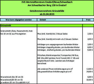 Der Zweckverband für die Verwertung von Grünabfällen der Gemeinden Ensdorf, Bous und Schwalbach hat auf seiner Sitzung am 28.02.2023 eine Erhöhung der Gebühren für die Abgabe von Grünschnitt beschlossen (siehe Liste). Die Änderung tritt zum 01.04.2023 in Kraft.