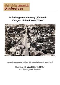 Am Sonntag, den 16.03.25 findet um 10.30 Uhr im Sitzungssaal des Rathauses die Gründungsversammlung des „Vereins für Ortsgeschichte Ensdorf/Saar“ statt. Nachdem Jahrzehnte lang einzelne Heimatforscher immer wieder die Geschichte unseres Ortes erforscht und darüber publiziert haben, gründete sich im Jahr 2018 der „Arbeitskreis Geschichte Ensdorf/Saar“. Seitdem konnte ein gesteigertes Interesse an der Ortsgeschichte in der Bevölkerung festgestellt werden, weshalb der Arbeitskreis zum Verein ausgebaut wird. Die Hauptaufgabe des Vereins wird es sein, sich um das historische Gemeindearchiv zu kümmern, die Ortsgeschichte zu erforschen und einmal jährlich die Zeitschrift „Geschichte Ensdorf/Saar“ zu publizieren. Weitere Aktivitäten sind in Zukunft denkbar. Vorschläge werden gerne entgegengenommen.