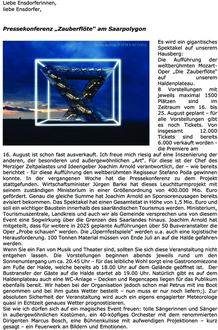 8 Vorstellungen mit jeweils maximal 1500 Plätzen sind im Zeitraum vom 16. bis 25. August geplant – für alle Vorstellungen gibt es noch Tickets. Von insgesamt 12.000 Tickets sind bereits 6.000 verkauft worden - die Premiere am 16. August ist schon fast ausverkauft. Ich freue mich riesig auf eine Inszenierung der anderen, der besonderen und außergewöhnlichen „Art“. Für diese ist der Chef des Merziger Zeltpalastes und Ideengeber Joachim Arnold verantwortlich, der – wie bereits berichtet - für diese Aufführung den weltberühmten Regisseur Stefano Poda gewinnen konnte. In der vergangenen Woche hat die Pressekonferenz zu dem Projekt stattgefunden. Wirtschaftsminister Jürgen Barke hat dieses Leuchtturmprojekt mit seinem zuständigen Ministerium in einer Größenordnung von 400.000 Mio. Euro gefördert. Genau die gleiche Summe hat Joachim Arnold an Sponsorenzusagen bereits avisiert bekommen. Das Spektakel hat einen Gesamtetat in Höhe von 1,5 Mio. Euro und soll ein wichtiger Baustein innerhalb des saarländischen Tourismus werden. Ministerium, Tourismuszentrale, Landkreis und auch wir als Gemeinde versprechen uns von diesem Event eine Sogwirkung über die Grenzen des Saarlandes hinaus. Joachim Arnold hat mitgeteilt, dass für weitere in 2025 geplante Aufführungen über 50 Busveranstalter die Oper „Probe schauen“ werden. Die „Opernfestspiele“ werden u.a. auch eine logistische Herausforderung. 100 Tonnen Material müssen von Ende Juli an auf die Halde gefahren werden.