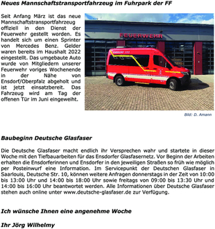 Seit Anfang März ist das neue Mannschaftstransportfahrzeug offiziell in den Dienst der Feuerwehr gestellt worden. Es handelt sich um einen Sprinter von Mercedes Benz. Gelder waren bereits im Haushalt 2022 eingestellt. Das umgebaute Auto wurde von Mitgliedern unserer Feuerwehr voriges Wochenende in der Nähe von Ensdorf/Oberpfalz abgeholt und ist jetzt einsatzbereit. Das Fahrzeug wird am Tag der offenen Tür im Juni eingeweiht.