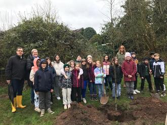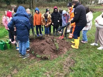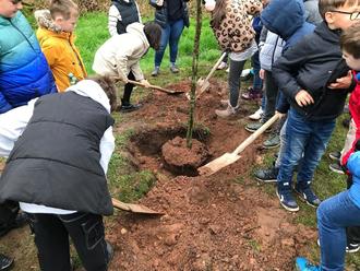 Der Gärtnertrupp des Bauhofes hatte die 3 Pflanzlöcher schon vorbereitet und Schippen und Gießkannen bereitgestellt. Nach der Begrüßung durch Bürgermeister Jörg Wilhelmy machten sich die Mädchen und Jungen eifrig daran, „ihre“ Bäume in die Erde zu bringen.