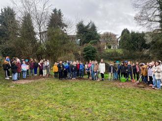 Es ist mittlerweile eine langjährige Tradition, dass die Erstklässler unserer Grundschule zum Beginn ihrer Schulzeit einen größeren Laubbaum auf einer öffentlichen Grünfläche pflanzen. Im Jahr 2020 fiel diese Aktion - wie so manches - Corona zum Opfer. Aus der Anfänger-Klasse ist mittlerweile eine Abschluss-Klasse geworden, und so meldeten sich die Kinder mit dem Wunsch, die Baumpflanzung nachzuholen bei der Verwaltung. Als „Abschiedsbäume“ pflanzten die 66 Kinder gemeinsam mit ihren Klassenlehrerinnen Marie Jung, Susanne Scherer und Petra Fromm drei Amberbäume (Liquidambar styraciflua) im Bereich des historischen Stollenmundlochs im Park.