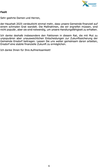der Haushalt 2025 verdeutlicht einmal mehr, dass unsere Gemeinde finanziell auf einem schmalen Grat wandelt. Die Maßnahmen, die wir ergreifen müssen, sind nicht populär, aber sie sind notwendig, um unsere Handlungsfähigkeit zu erhalten.