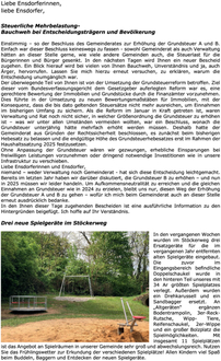 Einstimmig – so der Beschluss des Gemeinderates zur Erhöhung der Grundsteuer A und B. Einfach war dieser Beschluss keineswegs zu fassen - sowohl Gemeinderat als auch Verwaltung hätten an dieser Stelle gerne, wie viele andere Gemeinden auch, die Steuerlast für die Bürgerinnen und Bürger gesenkt. In den nächsten Tagen wird Ihnen ein neuer Bescheid zugehen. Ein Blick hierauf wird bei vielen von Ihnen Bauchweh, Unverständnis und ja, auch Ärger, hervorrufen. Lassen Sie mich hierzu erneut versuchen, zu erklären, warum die Entscheidung unumgänglich war.