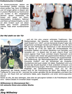 … und mit ihm eine unserer schönsten Traditionen: Das Maibaumsetzen. Der Gewerbe- und Handwerkerverein „St. Josef Ensdorf e.V. 1953“ und die Gemeinde Ensdorf laden alle Bürgerinnen und Bürger herzlich zum Maifest ein. Am 30. April fällt auf dem Marktplatz der Startschuss in den Wonnemonat Mai. Bereits ab 17:00 Uhr laden die Verkaufsstände mit herzhaften Speisen und kühlen Getränken zum Genießen und Verweilen ein – in diesem Jahr ist auch „Davy’s Pinsa“ mit einem eigenen Food Truck vertreten Unsere Feuerwehr wird auch in diesem Jahr wieder den geschmückten Maibaum setzen – ein Zeichen für Gemeinschaft, Frühling und Zusammenhalt. Der Fanfarenzug, der Männergesangsverein „MGV Heiterkeit-Concordia Ensdorf“ und die Schulkinder der Ensdorfer Grundschule sind auch wieder mit dabei. Musikalisch wird uns abends das Akustik-Quartett 4 Rock ordentlich einheizen und für beste Stimmung sorgen. Mein herzliches Dankeschön an die Mitglieder des Handwerkervereins, nicht nur für die „Bespielung“ der Stände, sondern auch für die Finanzierung der Band. Das Maifest ist ein Treffpunkt für Jung und Alt – kommen Sie vorbei, genießen Sie die Atmosphäre und feiern Sie mit uns. Ich freue mich auf zahlreiche Gäste, gute Gespräche und einen stimmungsvollen Abend!