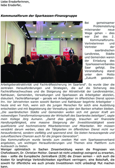Bei gemeinsamer Problemstellung miteinander neue Wege gehen – dies war Ziel des 2. Kommunalforums. Vertreterinnen und Vertreter der saarländischen Landkreise, Städte und Gemeinden waren der Einladung des Sparkassenverbandes Saar gefolgt. Die Veranstaltung stand unter dem Motto „Zukunft gestalten: Arbeitgeberattraktivität und Fachkräftesicherung im Saarland“. Es wurde über die zentralen Herausforderungen und Strategien, die auf die Sicherung des Fachkräftenachwuchses und die Steigerung der Attraktivität der Landkreisämter, Rathäuser, Gemeinden, Verwaltungen und Sparkassen als Arbeitgeber abzielen, diskutiert. Fachkräftemangel – gerade wir Arbeitgeber im öffentlichen Dienst spüren ihn. Vor Jahrzehnten waren sowohl Banken und Rathäuser begehrte Arbeitgeber – heute sind wir froh, wenn sich die jungen Menschen für solch eine Ausbildung entscheiden und mit Begeisterung der Verwaltung oder den Banken erhalten bleiben. „Die saarländischen Städte und Gemeinden wollen sich mit ganzer Kraft am notwendigen Transformationsprozess der Wirtschaft des Saarlandes beteiligen“, sagte mein Kollege Jörg Aumann. „Damit dies gelingt, brauchen wir finanzielle Handlungsfähigkeit, eine massive Steigerung der Investitionstätigkeit sowie qualifizierte und hochmotivierte Mitarbeiterinnen und Mitarbeiter. Wir müssen verstärkt darum werben, dass die Tätigkeiten im öffentlichen Dienst nicht nur herausfordernd, sondern vielfältig und spannend sind. Sie bieten herausragende und zukunftssichere Chancen auch für die jüngere Generation“.