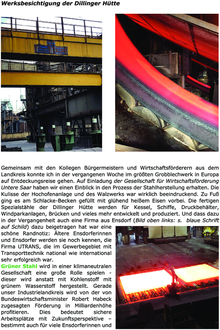 Gemeinsam mit den Kollegen Bürgermeistern und Wirtschaftsförderern aus dem Landkreis konnte ich in der vergangenen Woche im größten Grobblechwerk in Europa auf Entdeckungsreise gehen. Auf Einladung der Gesellschaft für Wirtschaftsförderung Untere Saar haben wir einen Einblick in den Prozess der Stahlherstellung erhalten. Die Kulisse der Hochofenanlage und des Walzwerks war wirklich beeindruckend. Zu Fuß ging es am Schlacke-Becken gefüllt mit glühend heißem Eisen vorbei. Die fertigen Spezialstähle der Dillinger Hütte werden für Kessel, Schiffe, Druckbehälter, Windparkanlagen, Brücken und vieles mehr entwickelt und produziert. Und dass dazu in der Vergangenheit auch eine Firma aus Ensdorf (Bild oben links: s. blaue Schrift auf Schild) dazu beigetragen hat war eine schöne Randnotiz: Ältere Ensdorferinnen und Ensdorfer werden sie noch kennen, die Firma UTRANS, die im Gewerbegebiet mit Transporttechnik national wie international sehr erfolgreich war.