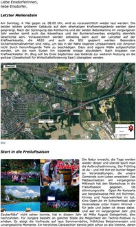 Am Sonntag, 4. Mai gegen ca. 08.00 Uhr, wird es voraussichtlich wieder laut werden: Die beiden letzten größeren Gebäude auf dem ehemaligen Kraftwerksgelände werden dann gesprengt. Nach der Sprengung des Kühlturms und der beiden Betonkamine im vergangenen Jahr werden somit auch das Kesselhaus und der Bunkerschwerbau endgültig ebenfalls Geschichte sein. Voraussichtlich werden zeitweilig dann auch der Leinpfad auf der Kraftwerksseite, die A620 und auch die B51 gesperrt werden. Besondere Sicherheitsmaßnahmen sind nötig, um das in der Nähe liegende Umspannwerk von Amprion nicht durch herumfliegende Teile zu beschädigen. Dazu sind eigens Wälle aufgeschüttet worden, um die nach Süden hin kippende Anlage abzufedern. Nach Angaben von Kraftwerksleiter Dr. Blug soll bis Ende September das Gelände zur weiteren Nutzung an die gwSaar (Gesellschaft für Wirtschaftsförderung Saar) übergeben werden.