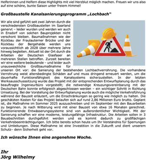 Wir alle sind gefühlt seit zwei Jahren durch die verschiedensten Großbaustellen im Saarland genervt – leider wurden und werden wir auch in Ensdorf von solchen Bauprojekten nicht verschont bleiben. Baumaßnahmen wie der Rückbau der Fraulauterner Brücke und der Rückbau der Bergehalde werden uns voraussichtlich ab 2028 über mehrere Jahre hinweg begleiten. Aktuell ist der Ort durch die Arbeiten der Deutschen Glasfaser an mehreren Stellen betroffen. Zurzeit bereiten wir eine weitere bedeutende – und leider auch unausweichliche Großbaumaßnahme für unseren Ort vor: die Sanierung der bestehenden Lochbachverrohrung. Die vorhandene Verrohrung weist altersbedingte Schäden auf und muss dringend erneuert werden, um die dauerhafte Funktionsfähigkeit des Kanalsystems sicherzustellen. In der letzten Werksausschusssitzung wurde das Projekt mit der entsprechenden Entwurfsplanung durch das beauftragte Ingenieurbüro vorgestellt; die notwendige Kreuzungsvereinbarung mit der Deutschen Bahn konnte erfolgreich abgeschlossen werden – ein wichtiger Schritt in Richtung Umsetzung. Bei der Vorstellung der Entwurfsplanung wurde auch die mögliche Verkehrsführung während der Bauzeit erläutert, um die Einschränkungen so gering wie möglich zu halten. Die geschätzten Kosten für das Projekt belaufen sich auf rund 2,86 Millionen Euro brutto. Geplant ist, die Maßnahme im Sommer 2025 auszuschreiben und im September mit den Bauarbeiten zu beginnen. Je nach Witterung wird mit einer Bauzeit von etwa 16 Monaten gerechnet. Funktionierende Entwässerungssysteme sind von außerordentlicher Wichtigkeit. Mit der Sanierung schaffen wir eine moderne, leistungsfähige Infrastruktur. Die Arbeiten sollen in 3 Bauabschnitten durchgeführt werden und es kommt dadurch zu großflächigen Verkehrsbeeinträchtigungen. Ich bitte bereits schon heute um Ihr Verständnis für Sperrungen und Umleitungen. Diese Maßnahme ist eine Investition in die Zukunft und dient unserem Schutz– denn Sicherheit geht vor.