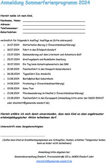 Endlich ist der Sommer da und mit ihm nahen die lang ersehnten Sommerferien! In diesem Jahr bieten wir euch sechs aufregende Wochen, in denen für jede*n etwas dabei ist!! Anmelden könnt ihr euch am Einfachsten über das Anmeldeformular, das ihr auf der letzten Seite findet. Füllt dieses aus (entsprechende Angebote ankreuzen und eure Kontaktdaten eintragen) und gibt es entweder bei der Gemeindeverwaltung Ensdorf, Provinzialstraße 101 a, ab oder schickt es mit per Email an shschmitt@gemeinde-ensdorf.de. Telefonisch erreicht ihr mich unter der 06831 504137. Ich freu mich auf euch!