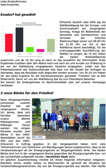 Neue Sitzgelegenheiten schmücken unseren Friedhof seit der vergangenen Woche. Ich denke, dass sich hierüber besonders unsere älteren Mitbürgerinnen und Mitbürger freuen werden. Vor einigen Monaten wurden zwei Bänke in den AWO-Werkstätten durch die SPD und den AWO-Ortsverein in Auftrag gegeben. In der Vergangenheit haben mich viele Teilnehmerinnen und Teilnehmer von Beerdigungen darauf angesprochen, dass es bei Verabschiedungen ab der Einsegnungshalle an Sitzgelegenheiten fehle. Die beiden Bänke sind nun in der vergangenen Woche gegenüber der Einsegnungshalle bzw. vor der Leichenhalle aufgestellt worden. Herzlichen Dank dafür.
