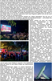 Diese Veranstaltungen zeigen: In unserer Gemeinde ist immer etwas los – für alle Generationen und mit ganz viel Herzblut organisiert. Für unsere Kinder und Jugendlichen bietet Sarah Schmitt ein attraktives Ferienprogramm mit vielen Highlights, die KJG ist auf dem Hasenberggelände bewährte Veranstalterin der Dorfrandfreizeit, sportliche Trainingscamps werden angeboten und nicht zuletzt wird am 30. August ein Vereinstag durchgeführt, wo sich die Ortsvereine zur Nachwuchsgewinnung vorstellen. Im September wird es zum wiederholten Male Deutsche Meisterschaften im Boule geben und unser beliebtes Hundeschwimmen. Zum ersten Mal wird ein Agility-Turnier -ebenfalls im September- durchgeführt.
