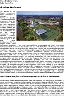 Die aktuellen hohen Temperaturen locken viele Besucherinnen und Besucher ins kühle Nass – somit strömten am vergangenen Sonntag bei sommerlicher Hitze rund 2.600 Gäste in unser Schwimmbad – ein neuer Besucherrekord in diesem Sommer, der mich besonders freut. Der ein oder andere wird vielleicht erstaunt gegen 16 Uhr am Nachmittag den Post der Gemeinde auf Instagram und Facebook gelesen haben, wonach vorübergehend im Schwimmbad nur noch dann Besucherinnen und Besucher eingelassen werden, wenn wiederum Gäste das Freibad verlassen. Bereits am frühen Nachmittag war die beherrschbare Grenze erreicht, weshalb das Schwimmbadteam sich dazu entschloss, das Bad vorübergehend für weitere Gäste zu schließen. Diese Entscheidungen im Einzelfall werden nicht leichtfertig getroffen, sondern dienen dem Schutz und der Sicherheit aller Badegäste. Gerade bei einem hohen Anteil an Nichtschwimmern oder wenn sich einzelne Badegäste nicht an die Regeln halten, ist es besonders wichtig, für geordnete Abläufe, ausreichend Platz und eine gute Übersicht zu sorgen. Unser erfahrenes Schwimmbadteam versucht auch in diesen angespannten Situationen einen kühlen Kopf zu behalten. Unterstützt wurde das Personal durch zusätzlich eingesetztes Sicherheitspersonal, das potenziell kritische Situationen frühzeitig entschärfen soll und schwierigen Besucherinnen und Besuchern mit der nötigen Konsequenz entgegentritt. Die Sicherheit aller Gäste – vor allem von Kindern und Familien – muss in solchen Fällen oberste Priorität haben. Ich bitte um Ihr Verständnis, wenn es in Ausnahmefällen wieder zu Einschränkungen kommen sollte. Ich bedanke mich bei dem gesamten Schwimmbadteam für den engagierten Einsatz und bei allen Gästen für ihr Verständnis und ihre Geduld. Gemeinsam sorgen wir dafür, dass das Schwimmbad auch an heißen Tagen ein schöner und sicherer Ort der Erholung bleibt.