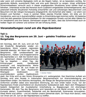 Am Sonntag, dem 29. Juni, wird am Fuß der Ensdorfer Bergehalde wieder ein besonderes Stück unserer regionalen Identität lebendig: Wir feiern den Tag des Bergmanns. Der Landesverband der Bergmanns-, Hütten- und Knappenvereine des Saarlandes e.V. lädt Sie herzlich dazu ein, gemeinsam diesen traditionsreichen Tag zu begehen – einen Tag, der Erinnerungen weckt, Dankbarkeit ausdrückt und bergmännische Werte hochhält. Bereits am 28. Juni findet ein Benefizkonzert mit dem Musikverein Rheingold Großrosseln mit anschließendem großen Zapfenstreich statt. Der Erlös wird an den Verein Ehrensache e.V. weitergeleitet. Den feierlichen Auftakt am Sonntag wird eine Parade in historischer Bergmannstracht zur Kranzniederlegung am Gedenkstein bilden. Die festliche Atmosphäre, die Klänge der Bergmannsmusik und die stolzen Uniformen schaffen dabei eine besondere Stimmung, die man erlebt haben muss. Vor der Repräsentanz findet anschließend ein ökumenischer Gottesdienst statt. Nach dem Mittagessen besteht Gelegenheit bei musikalischer Unterhaltung zu Begegnungen mit ehemaligen Kameraden. Mit dem Tag des Bergmanns wird besonders an die Werte erinnert, die für die Kumpels stehen: Zusammenhalt, Solidarität und die Bereitschaft, füreinander einzustehen. Diese Werte sind zeitlos – und sie machen unsere Gemeinde stark. Ich freue mich darauf, viele von Ihnen am 29. Juni an der Repräsentanz zu treffen.