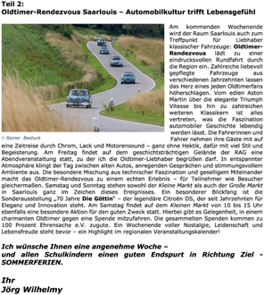 Am kommenden Wochenende wird der Raum Saarlouis auch zum Treffpunkt für Liebhaber klassischer Fahrzeuge: Oldtimer-Rendezvous lädt zu einer eindrucksvollen Rundfahrt durch die Region ein. Zahlreiche liebevoll gepflegte Fahrzeuge aus verschiedenen Jahrzehnten lassen das Herz eines jeden Oldtimerfans höherschlagen. Vom edlen Aston Martin über die elegante Triumph Vitesse bis hin zu zahlreichen weiteren Klassikern ist alles vertreten, was die Faszination automobiler Geschichte lebendig werden lässt. Die Fahrerinnen und Fahrer nehmen ihre Gäste mit auf eine Zeitreise durch Chrom, Lack und Motorensound – ganz ohne Hektik, dafür mit viel Stil und Begeisterung. Am Freitag findet auf dem geschichtsträchtigen Gelände der RAG eine Abendveranstaltung statt, zu der ich die Oldtimer-Liebhaber begrüßen darf. In entspannter Atmosphäre klingt der Tag zwischen alten Autos, anregenden Gesprächen und stimmungsvollem Ambiente aus. Die besondere Mischung aus technischer Faszination und geselligem Miteinander macht das Oldtimer-Rendezvous zu einem echten Erlebnis – für Teilnehmer wie Besucher gleichermaßen. Samstag und Sonntag stehen sowohl der Kleine Markt als auch der Große Markt in Saarlouis ganz im Zeichen dieses Ereignisses. Ein besonderer Blickfang ist die Sonderausstellung „70 Jahre Die Göttin“ – der legendäre Citroën DS, der seit Jahrzehnten für Eleganz und Innovation steht. Am Samstag findet auf dem Kleinen Markt von 10 bis 15 Uhr ebenfalls eine besondere Aktion für den guten Zweck statt. Hierbei gibt es Gelegenheit, in einem charmanten Oldtimer gegen eine Spende mitzufahren. Die gesammelten Spenden kommen zu 100 Prozent Ehrensache e.V. zugute. Ein Wochenende voller Nostalgie, Leidenschaft und Lebensfreude steht bevor – ein Highlight im regionalen Veranstaltungskalender!