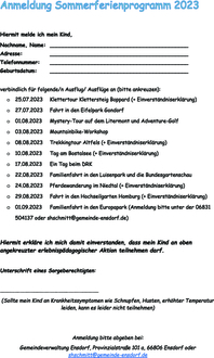 Anmelden könnt ihr euch bei mir am Einfachsten über das Anmeldeformular, das ihr auf der letzten Seite findet. Füllt dieses aus (entsprechende Angebote ankreuzen und eure Kontaktdaten eintragen) und gibt es entweder bei der Gemeindeverwaltung Ensdorf, Provinzialstraße 101 a, ab oder schickt es mit per Email an shschmitt@gemeinde-ensdorf.de. Telefonisch erreicht ihr mich unter der 06831 504137.