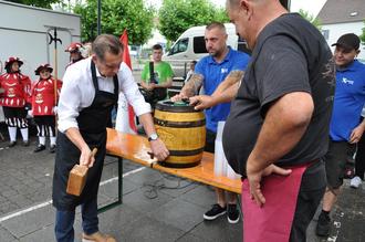 Da kam er nun, der lang ersehnte Regen. Pünktlich zur Eröffnung der Ensdorfer Kirmes regnete es Heugabeln. Glücklicherweise handelte es sich aber nur um einen kurzen Schauer, sodass der Bürgermeister Jörg Wilhelmy gemeinsam mit Thomas Spangenberger, dem Sprecher der Schaustellergemeinschaft zum Fassanstich um kurz nach 18 Uhr das Kirmestreiben eröffnen konnte und ein herrlicher Sommerabend, der dann folgte, doch noch zahlreiche Gäste am Samstag in die Partymeile lockte, wo die Band „Fooling Around“ mit bekannten Hits aus Rock und Pop zum Mitsingen nach dem Motto „nicht schön - Hauptsache laut“ für beste Stimmung sorgte.