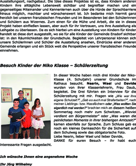 In diesem Fall reist das Dorf unserer französischen Partner-gemeinde Wizernes in die Grundschule nach Ensdorf. Bei unserem diesjährigen Freundschafts- und Jubiläumsbesuch im Mai 2023 überraschten die Kinder der Grundschule Wizernes die Mitglieder des Partnerschaftsvereins und auch die Vertreterinnen und Vertreter der Gemeindeverwaltung mit einer liebevoll gestalteten Ausstellung über ihr Dorf. Neben Informationen über das Leben und Aktivitäten in Wizernes aus Sicht der Wizerner Kinder, umfasst die Ausstellung auch selbst gebaute Miniaturbauwerke zentraler Gebäude. So wurden durch diese neben dem Rathaus von Wizernes und einzelnen wichtigen Geschäften des Dorfes auch deren Klassenzimmer und die La Coupole, ein deutsches Bauwerk aus dem 2. Weltkrieg und heute ein Museum und Ausstellungsort, nachgebaut. Die Idee dieses Projektes ist es, dass Kindern anderen Kindern ihre alltägliche Lebenswelt sichtbar und begreifbar machen und ein gegenseitiges Miteinander und Kennenlernen auch über die Hürde der Sprachbarriere hinaus möglich, machbar und wünschenswert ist. Ich bedanke mich hiermit ganz herzlich bei unseren französischen Freunden und im Besonderen bei den Schülerinnen und Schülern aus Wizernes. Zum einen für die Mühe und Arbeit, die sie in dieses Projekt haben einfließen lassen, aber auch für ihr Vertrauen, uns ihre Ausstellung als Leihgabe zu überlassen. Da es sich hierbei um eine Ausstellung von Kindern für Kinder handelt ist diese dort ausgestellt, wo sie für alle Kinder der Gemeinde Ensdorf sichtbar ist: in den Räumlichkeiten der Grundschule. Begleitet von Lehrpersonal können sich unsere Schülerinnen und Schüler die Ausstellung ansehen, Eindrücke einer anderen Gemeinde erlangen und ein Stück weit die Perspektive unserer französischen Freunde einnehmen.