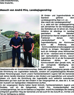 U. a. setzt sich der Landesjugendring seit Jahrzehnten für die Herabsetzung des Wahlalters ab 16 Jahren ein. Diese Initiative ist allerdings im Landtag gescheitert. Als kleinsten gemeinsamen Nenner einigten sich die Fraktionen darauf, mehr „Verbindlichkeit“ in die Jugendbeteiligung der Kommunen durch die Änderung des Kommunalselbstverwaltungsgesetzes (KSVG) zu bringen. Wenngleich ich auch ein Anhänger eines Wahlrechtes ab 16 bin - niemand wird im nächsten Jahr nachvollziehen können, warum Jugendliche mit 16 an der Europawahl teilnehmen dürfen, an der Kommunalwahl aber gerade nicht, ist die zwingende Beteiligung der Jugendlichen durch die Gesetzesnovelle ein Kompromissvorschlag. Dabei soll Jugendbeteiligung gerade nicht die Einrichtung von Jugendräten bedeuten, sondern ein projektbezogenes Mitreden dieser Personengruppe. Durch unsere Fachbereichsleiterin Jugend hält die Gemeinde seit Jahren bereits intensiven Kontakt zu den Kindern und Jugendlichen und versucht diesen z.B. durch die Einrichtung des Jugendcafés auch weiterhin auszubauen. Besonders gut kam auch bei den Kindern in der Vergangenheit an, dass sie z. B. bei der Auswahl von Spielgeräten mitbestimmen durften.